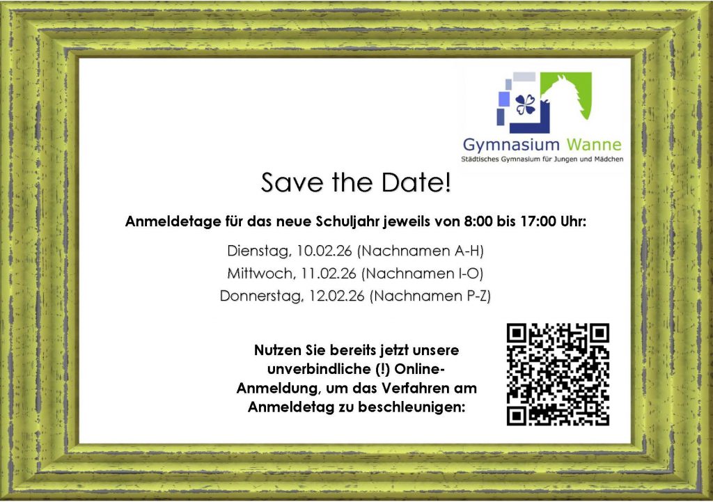 Es ist geplant, am 29.05.26 ein Treffen aller Ehemaligen des Gymnasiums Wanne zu veranstalten. Ehemalige Schülerinnen und Schüler sowie ehemalige Mitarbeiterinnen und Mitarbeiter (Lehrkräfte, Verwaltungspersonal, etc.) sind herzlich eingeladen, zwischen 17 und 22 Uhr ein paar schöne Stunden an ihrer alten Schule zu verbringen. Nähere Informationen folgen in Kürze. Über diesen Link könnt ihr Euch anmelden: Anmeldung Ehemaligentreffen oder scannt einfach den QR Code.