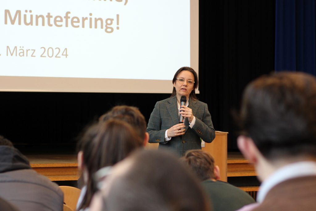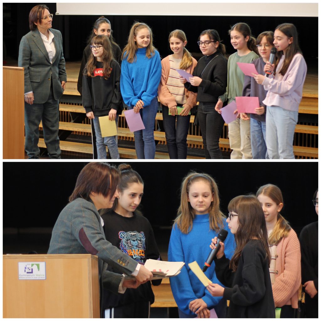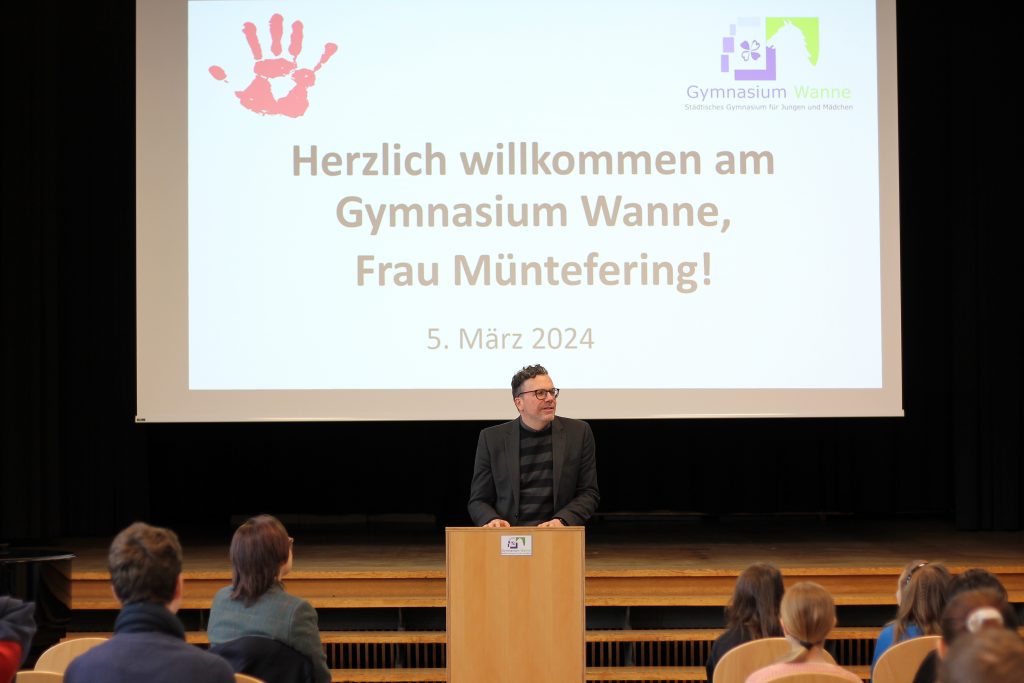 „Heute kommen Groß und Klein zusammen“, leitete der stellvertretende Schulleiter, Herr Heinichen, die Veranstaltung ein, in der sowohl die jüngsten Schüler*innen als auch die ältesten Schüler*innen des Gymnasium Wanne die Gelegenheit hatten, ihre Anliegen und Fragen an die Bundestagsabgeordnete Frau Müntefering heranzutragen.